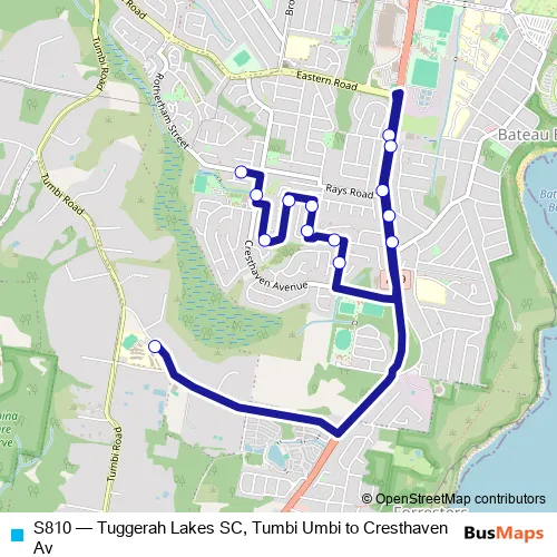 Click here to view the nearest S810 - Tuggerah Lakes SC, Tumbi Umbi to Cresthaven Av bus stop.