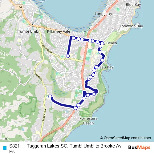 Click here to view the nearest S821 - Tuggerah Lakes SC, Tumbi Umbi to Brooke Av Ps bus stop.
