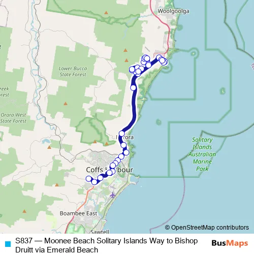 The first stop of the S837 bus route is 545 Solitary Islands Way and the last stop is Bishop Druitt College, North Boambee Rd. S837 (Moonee Beach Solitary Islands Way to Bishop Druitt via Emerald Beach) is operational during on weekdays.