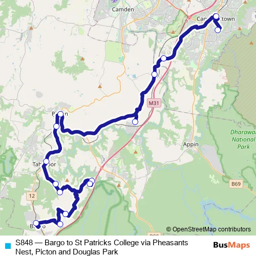 The first stop of the S848 bus route is Bargo Station, Railside Av and the last stop is St Patrick's College, St Johns Rd. S848 (Bargo to St Patricks College via Pheasants Nest, Picton and Douglas Park) is operational during on weekdays.