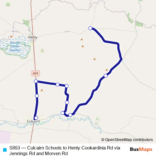 Click here to view the nearest S853 - Culcairn Schools to Henty Cookardinia Rd via Jennings Rd and Morven Rd bus stop.