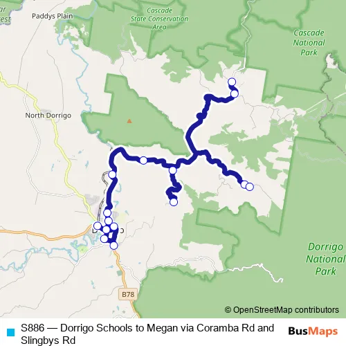 Click here to view the nearest S886 - Dorrigo Schools to Megan via Coramba Rd and Slingbys Rd bus stop.