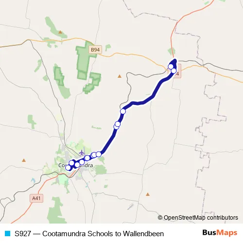 The first stop of the S927 bus route is Sacred Heart Central School, Sutton St and the last stop is Wallendbeen Public School, King St. S927 (Cootamundra Schools to Wallendbeen) is operational during on weekdays.