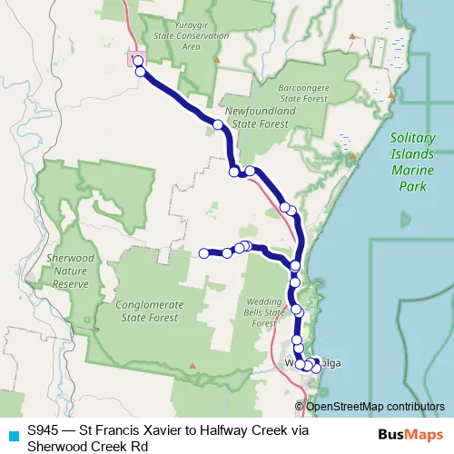 The first stop of the S945 bus route is St Francis Xavier School, Waterloo St and the last stop is Luthers Rd At Pacific Hwy. S945 (St Francis Xavier to Halfway Creek via Sherwood Creek Rd) is operational during on weekdays.