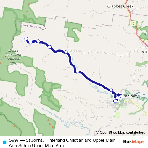 The first stop of the S997 bus route is St John's Primary School, Casuarina St and the last stop is Main Arm Rd At Motts Rd. S997 (St Johns, Hinterland Christian and Upper Main Arm Sch to Upper Main Arm) is operational during on weekdays.