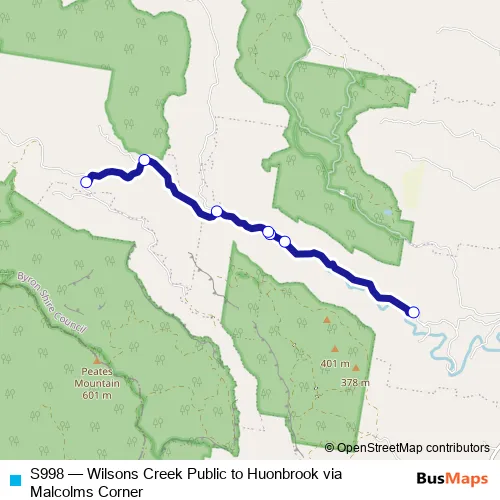 The first stop of the S998 bus route is Wilsons Creek Rd Opp 1020 and the last stop is Wilsons Creek Public School, Wilsons Creek Rd. S998 (Wilsons Creek Public to Huonbrook via Malcolms Corner) is operational during on weekdays.
