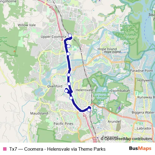 The first stop of the Tx7 bus route is Coomera station, stop B and the last stop is Helensvale station. Tx7 (Coomera - Helensvale via Theme Parks) is operational during everyday.