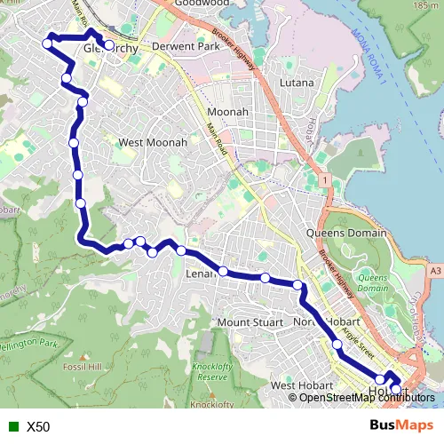 The first stop of the X50 bus route is Hobart City Interchange Stop B1 and the last stop is Glenorchy Terminus Stop F. X50 is operational during on weekdays.