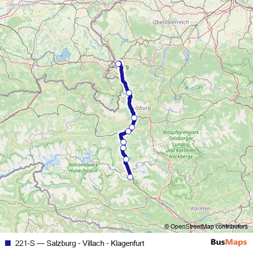 The first stop of the 221-S rail route is Salzburg Hauptbahnhof and the last stop is Mallnitz-Obervellach Bahnhof. 221-S (Salzburg - Villach - Klagenfurt) is operational during everyday.