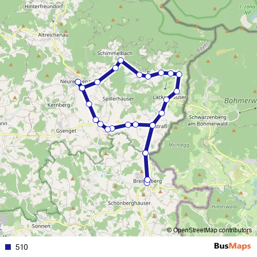 The first stop of the 510 bus route is Neureichenau, Rathaus and the last stop is Neureichenau, Rathaus. 510 is operational during on weekdays.