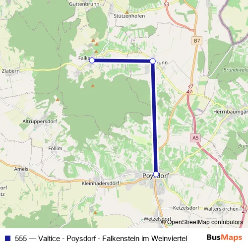 The first stop of the 555 bus route is Falkenstein im Weinviertel, Marktplatz and the last stop is Poysdorf, Dreifaltigkeitsplatz. 555 (Valtice - Poysdorf - Falkenstein im Weinviertel) is operational during on weekends.