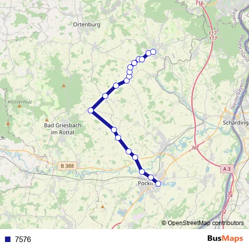 The first stop of the 7576 bus route is Pocking, Gymnasium and the last stop is