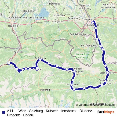 The first stop of the A14 rail route is Wörgl Hbf and the last stop is Salzburg Hauptbahnhof. A14 (Wien - Salzburg - Kufstein - Innsbruck - Bludenz - Bregenz - Lindau) is operational during everyday.
