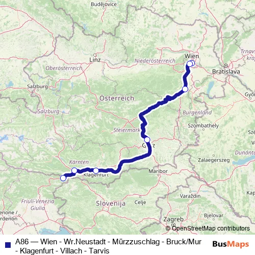 The first stop of the A86 rail route is Wien Hauptbahnhof and the last stop is Tarvisio Citta Boscoverde. A86 (Wien - Wr.Neustadt - Mürzzuschlag - Bruck/Mur - Klagenfurt - Villach - Tarvis) is operational during everyday.