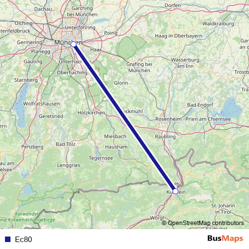 The first stop of the Ec80 bus route is Bahnhof, Kufstein (A) and the last stop is Ostbahnhof, München. Ec80 is operational during everyday.