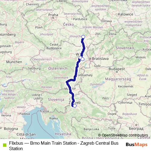 The first stop of the Flixbus bus route is Zagreb Central Bus Station and the last stop is Brno Benesova Bus Station. Flixbus (Brno Main Train Station - Zagreb Central Bus Station) is operational during everyday.