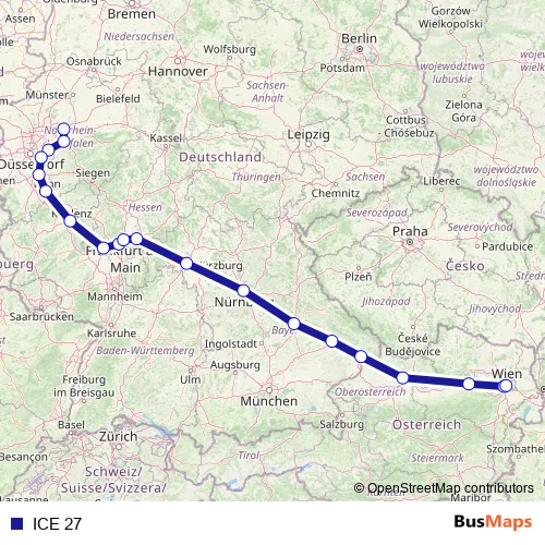 The first stop of the ICE 27 rail route is Dortmund Hbf and the last stop is Wien Hbf. ICE 27 is operational during everyday.