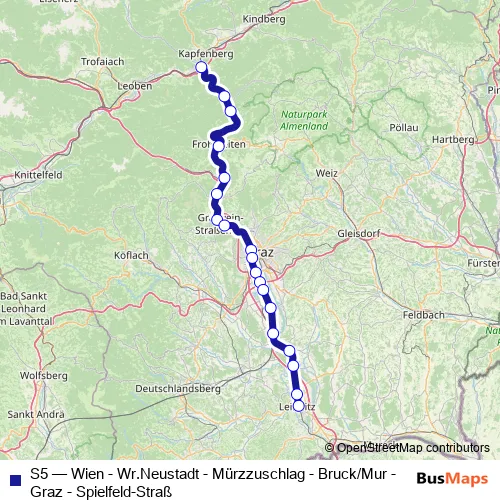 The first stop of the S5 rail route is Bruck/Mur Bahnhof 4 and the last stop is Leibnitz Bahnhof. S5 (Wien - Wr.Neustadt - Mürzzuschlag - Bruck/Mur - Graz - Spielfeld-Straß) is operational during on weekdays.
