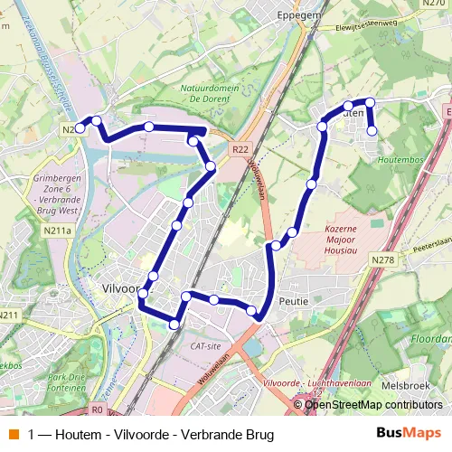 The first stop of the 1 bus route is Vilvoorde Houtem Vierbunder and the last stop is Grimbergen Verbrande Brug. 1 (Houtem - Vilvoorde - Verbrande Brug) is operational during everyday.