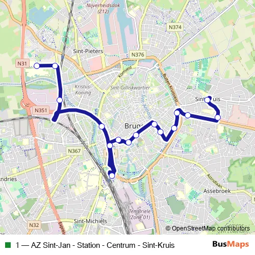 The first stop of the 1 bus route is Sint-Pieters AZ Sint-Jan and the last stop is Sint-Kruis Kerk. 1 (AZ Sint-Jan - Station - Centrum - Sint-Kruis) is operational during everyday.