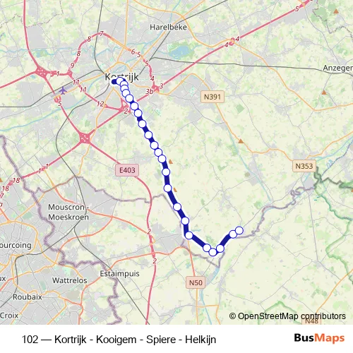 The first stop of the 102 bus route is Kortrijk Busterminal 3 perron 33 and the last stop is Helkijn Centrum. 102 (Kortrijk - Kooigem - Spiere - Helkijn) is operational during on weekdays.