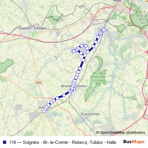 The first stop of the 116 bus route is Rebecq Gare and the last stop is Halle Station - Perron 8. 116 (Soignies - Br.-le-Comte - Rebecq -Tubize - Halle) is operational during everyday.