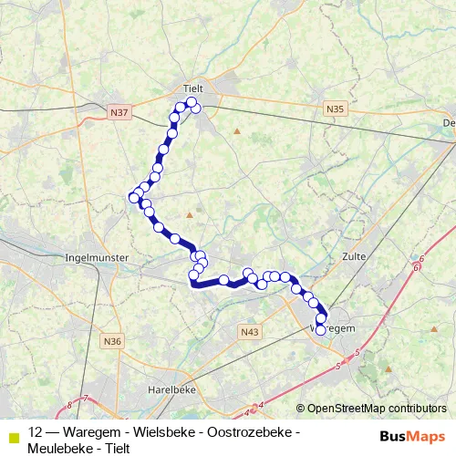 The first stop of the 12 bus route is Tielt Station perron 1 and the last stop is Waregem Scholen Westerlaan. 12 (Waregem - Wielsbeke - Oostrozebeke - Meulebeke - Tielt) is operational during everyday.