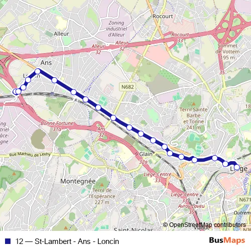 The first stop of the 12 bus route is Loncin Rue A. Charlet and the last stop is Liege Place St-Lambert - Quai A. 12 (St-Lambert - Ans - Loncin) is operational during everyday.