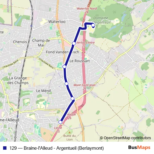 The first stop of the 129 bus route is Waterloo Berlaymont and the last stop is Braine-L'Alleud Route de Nivelles. 129 (Braine-l'Alleud - Argentueil (Berlaymont)) is operational during on weekdays.