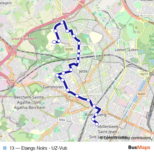 The first stop of the 13 bus route is Etangs Noirs and the last stop is UZ-Vub. 13 (Etangs Noirs - UZ-Vub) is operational during everyday.