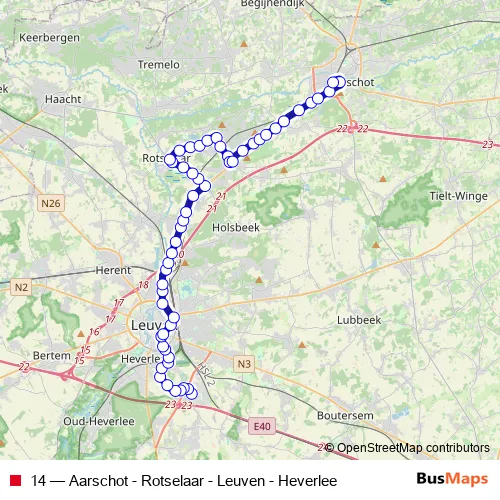 The first stop of the 14 bus route is Heverlee Kazerne (H. Hart) and the last stop is Rotselaar Rotonde. 14 (Aarschot - Rotselaar - Leuven - Heverlee) is operational during everyday.