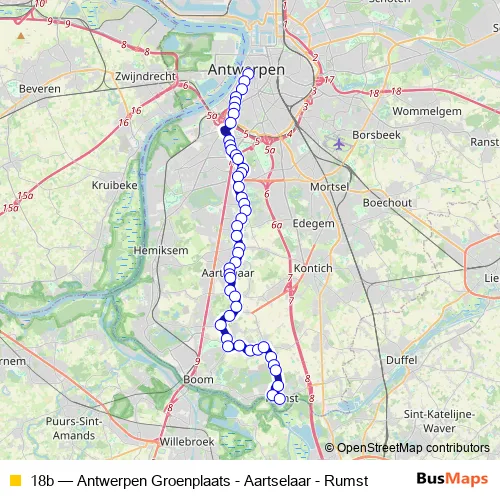 The first stop of the 18b bus route is Antwerpen Groenplaats and the last stop is Rumst Busstation. 18b (Antwerpen Groenplaats - Aartselaar - Rumst) is operational during everyday.