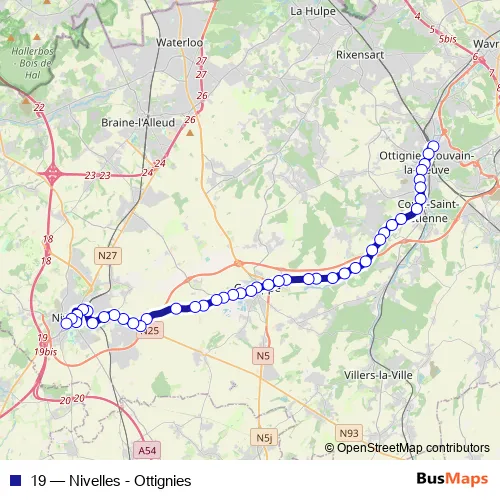 The first stop of the 19 bus route is Ottignies Gare - Av. Droits de l'Homme and the last stop is Nivelles Collège (Rue de Mons). 19 (Nivelles - Ottignies) is operational during everyday.