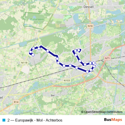 The first stop of the 2 bus route is Mol Vito-Irmm and the last stop is Mol Achterbos. 2 (Europawijk - Mol - Achterbos) is operational during everyday.