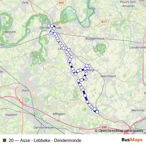 The first stop of the 20 bus route is Asse Station and the last stop is Dendermonde Kerk. 20 (Asse - Lebbeke - Dendermonde) is operational during on weekdays.