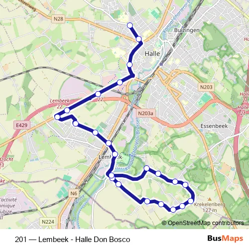 The first stop of the 201 bus route is Lembeek Sas and the last stop is Halle Don Bosco. 201 (Lembeek - Halle Don Bosco) is operational during on weekdays.