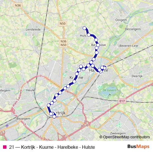 The first stop of the 21 bus route is Kortrijk Busterminal 6 perron 64 and the last stop is Hulste Kwademeerslaan. 21 (Kortrijk - Kuurne - Harelbeke - Hulste) is operational during everyday.