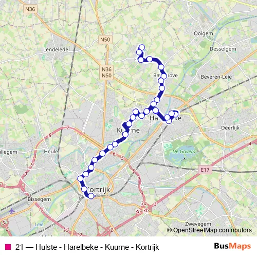 The first stop of the 21 bus route is Hulste Kwademeerslaan and the last stop is Kortrijk Busterminal 6 perron 64. 21 (Hulste - Harelbeke - Kuurne - Kortrijk) is operational during everyday.