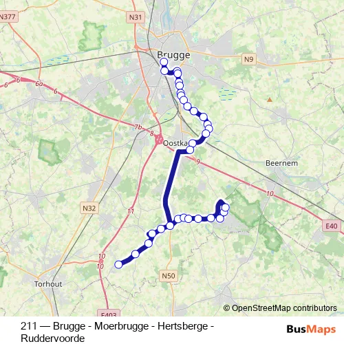 The first stop of the 211 bus route is Brugge 't Zand perron B4 and the last stop is Ruddervoorde Baliebrugge Kerk. 211 (Brugge - Moerbrugge - Hertsberge - Ruddervoorde) is operational during on weekdays.