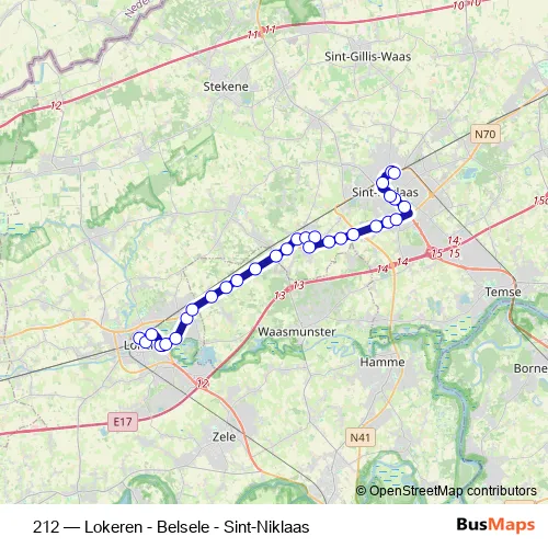 The first stop of the 212 bus route is Lokeren Station perron 6 and the last stop is Sint-Niklaas Station perron 5. 212 (Lokeren - Belsele - Sint-Niklaas) is operational during on weekdays.