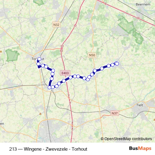 The first stop of the 213 bus route is Torhout Station perron 2 and the last stop is Wingene Dorp. 213 (Wingene - Zwevezele - Torhout) is operational during on weekdays.