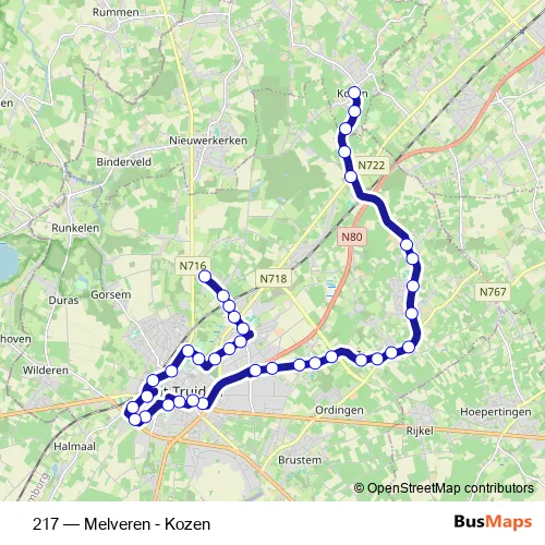 The first stop of the 217 bus route is Kozen Kerk and the last stop is Melveren Sancta Maria. 217 (Melveren - Kozen) is operational during everyday.
