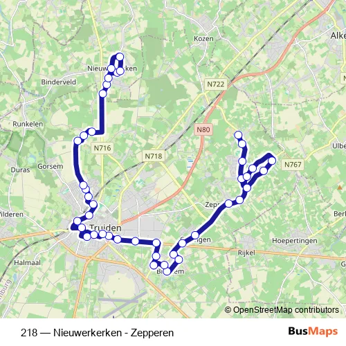 The first stop of the 218 bus route is Zepperen Stokstraat and the last stop is Nieuwerkerken Kerk. 218 (Nieuwerkerken - Zepperen) is operational during everyday.