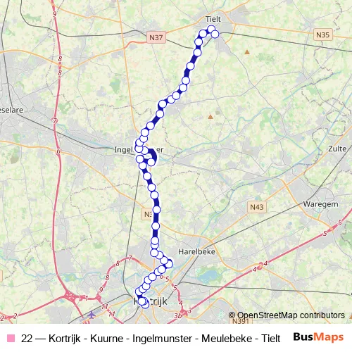 The first stop of the 22 bus route is Kortrijk Busterminal 6 perron 62 and the last stop is Tielt Station perron 1. 22 (Kortrijk - Kuurne - Ingelmunster - Meulebeke - Tielt) is operational during everyday.
