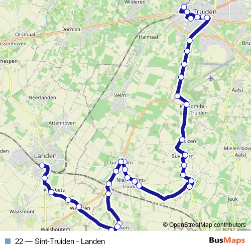 The first stop of the 22 bus route is Sint-Truiden Station perron 6 and the last stop is Landen Station perron 2. 22 (Sint-Truiden - Landen) is operational during everyday.
