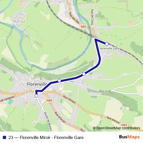 The first stop of the 23 bus route is Florenville Gare and the last stop is Florenville Place du Miroir - Quai 1. 23 (Florenville Miroir - Florenville Gare) is operational during everyday.