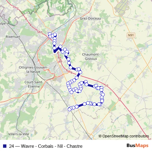 The first stop of the 24 bus route is Wavre Gare - Quai 10 and the last stop is Chastre Dépôt. 24 (Wavre - Corbais - Nil - Chastre) is operational during on weekdays.