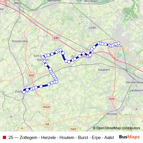 The first stop of the 25 bus route is Zottegem Station perron 5 and the last stop is Aalst Station perron 3. 25 (Zottegem - Herzele - Houtem - Burst - Erpe - Aalst) is operational during everyday.