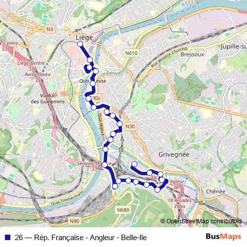 The first stop of the 26 bus route is Liege République Française - Quai A and the last stop is Liege Belle-Île. 26 (Rép. Française - Angleur - Belle-Ile) is operational during everyday.