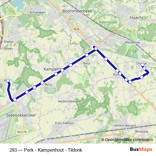 The first stop of the 293 bus route is Perk Kerk and the last stop is Tildonk Sint-Angela. 293 (Perk - Kampenhout - Tildonk) is operational during on weekdays.